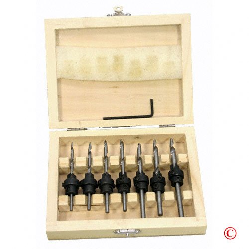 7 precision wood drills from .125" to .250."' Dia, each with countersinks and adjustable collets for adjustable depths and allen wrench. Comes in a wood case for easy storage.